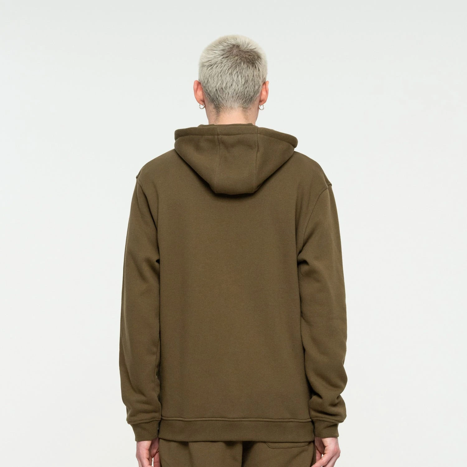 80% cotton, 20% polyester 330gsm brushed fleece, regular fit, hooded sweatshirt with pouch pocket and front twill applique