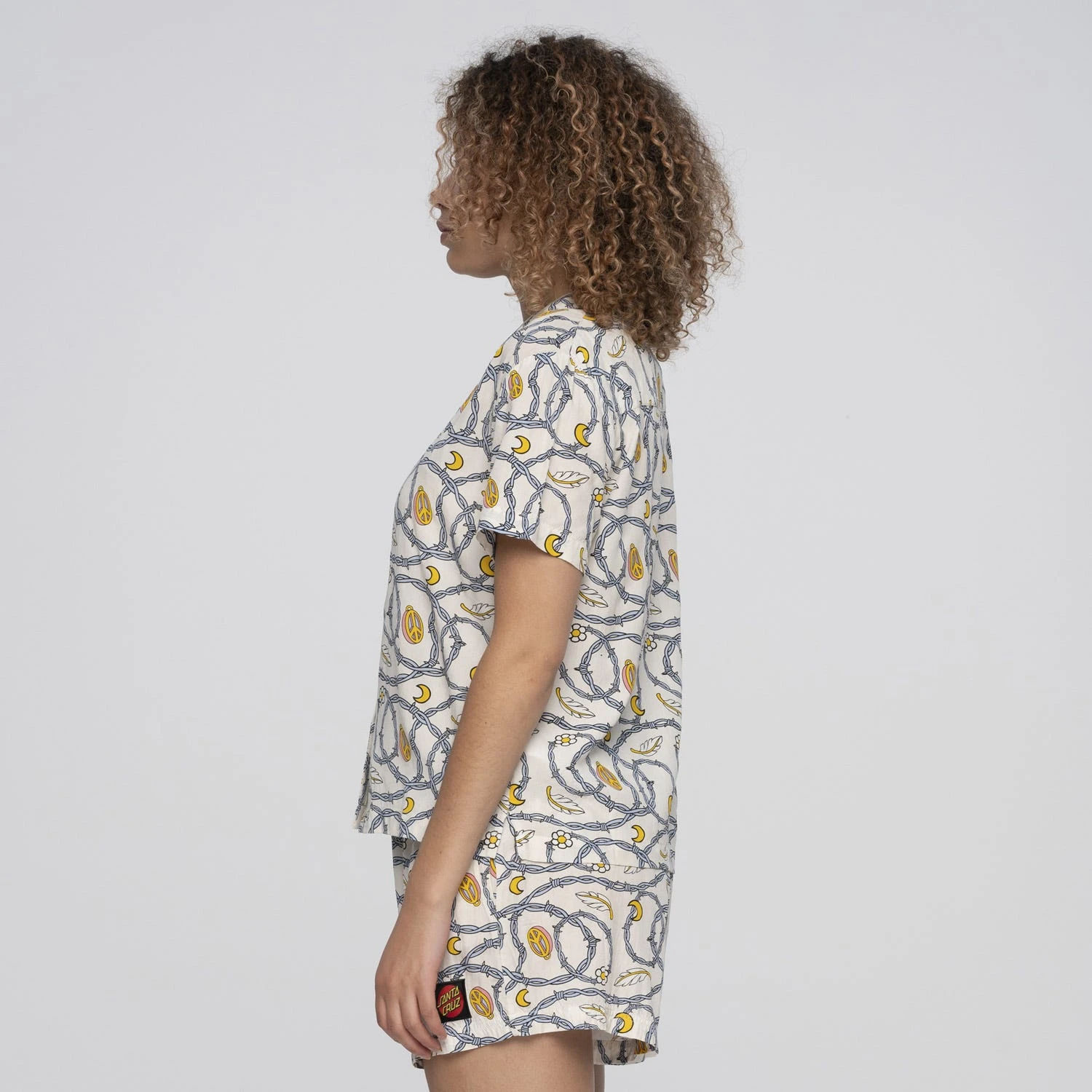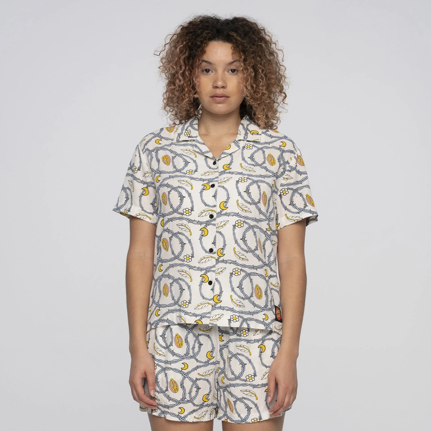 100% rayon, regular fit, short sleeve camp collar shirt with all-over print and woven label branding at hem