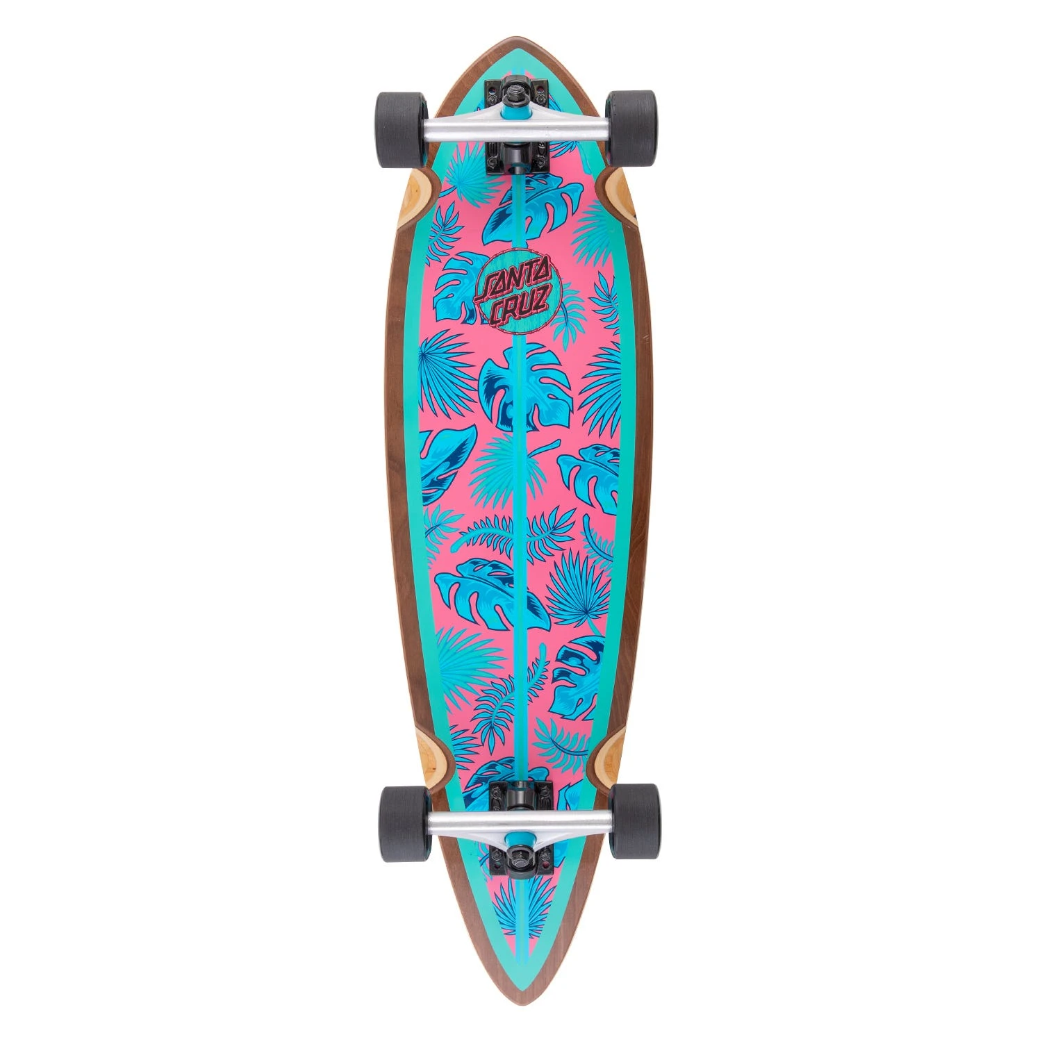 Santa Cruz Skateboards Cabana Dot Pintail Longboard Cruzer featuring updated, smaller pintail shape on 9 ply deck with Bullet 160mm reverse kingpin trucks and Santa Cruz branded 60mm 78a Slimeballs wheels.