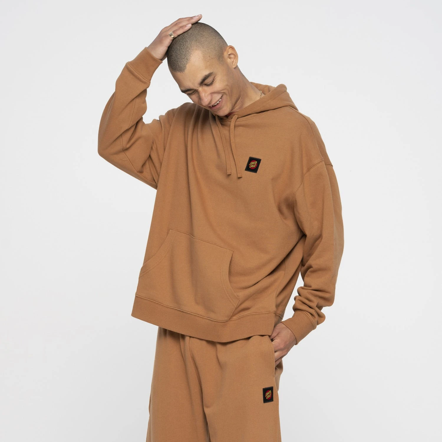 100% organic cotton, 330gsm loopback fleece, boxy fit, hooded sweatshirt with pouch pocket and left chest woven label