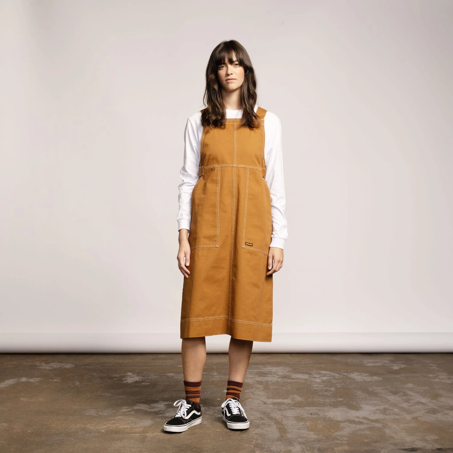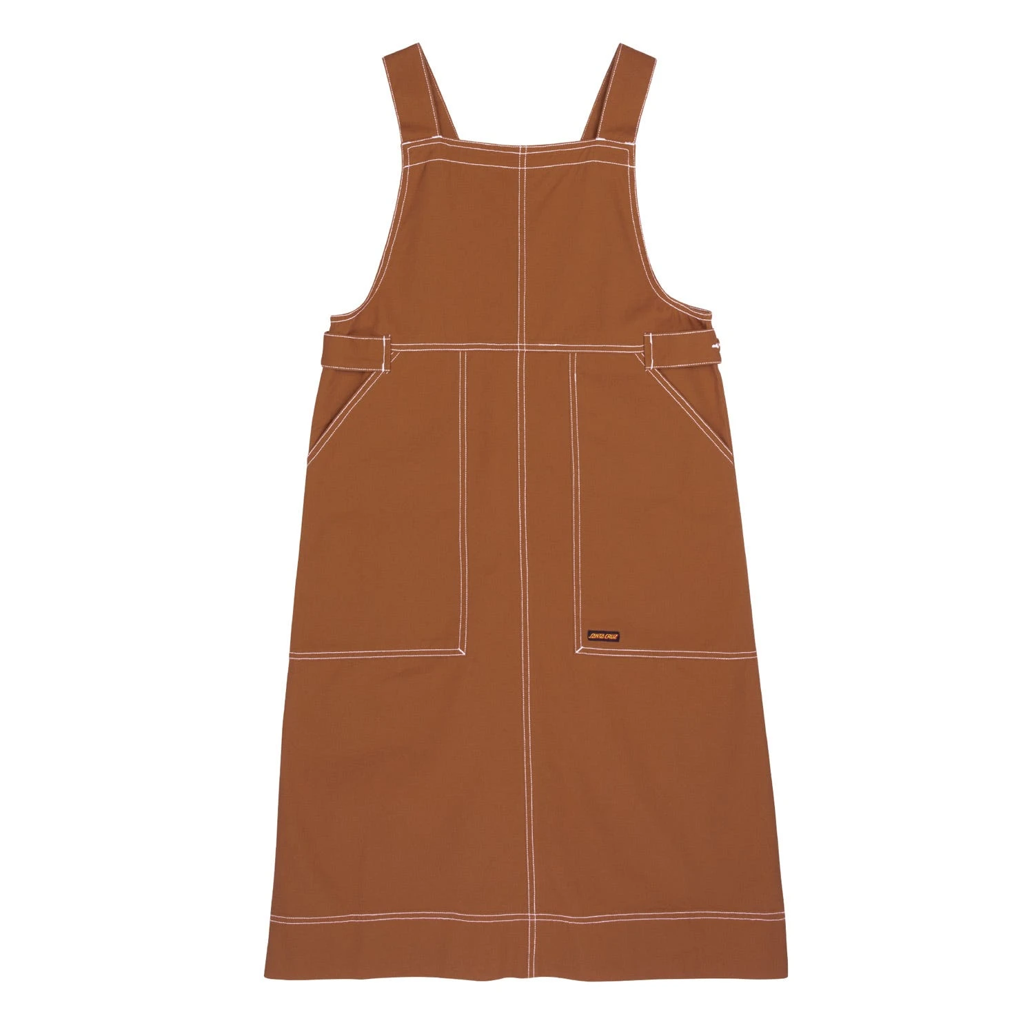 100% cotton twill, regular fit, pinafore dress with adjustable waist tabs, carpenter front patch pockets with woven label branding and back pockets with woven label branding