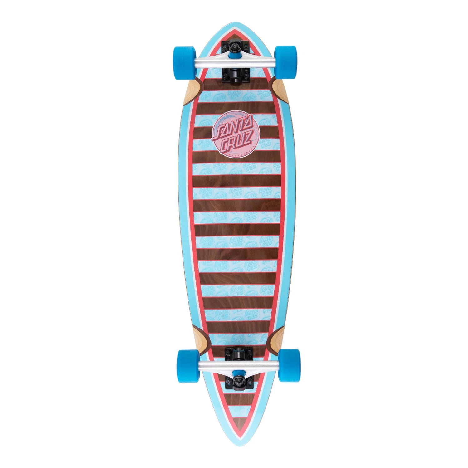 Santa Cruz Skateboards Decoder Wave Pintail Longboard Cruzer featuring updated, smaller pintail shape on 9 ply deck with Bullet 160mm reverse kingpin downhill trucks and Santa Cruz branded 60mm 78a Slimeballs wheels. Deck print changes when viewing through the included decoder lens hangtag.