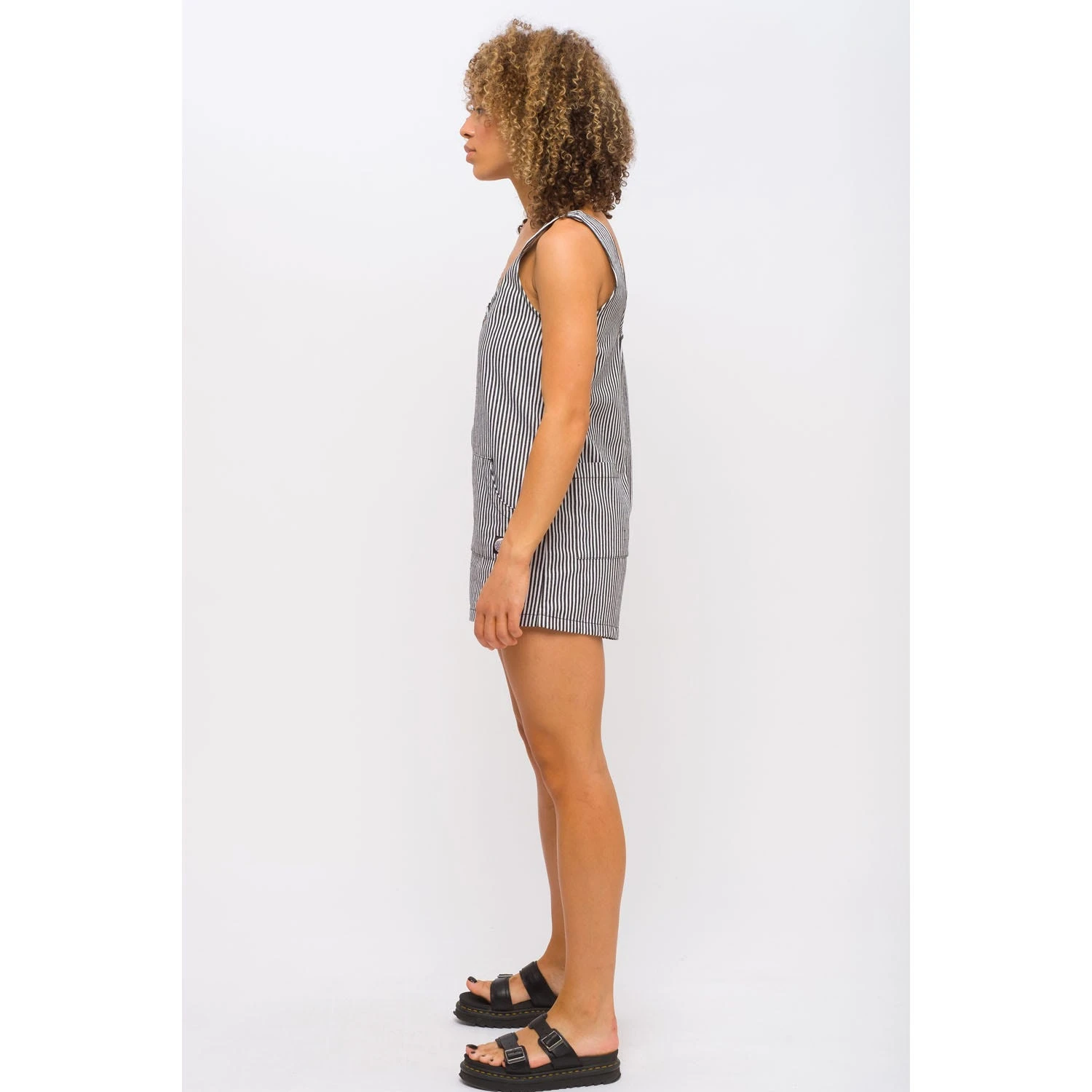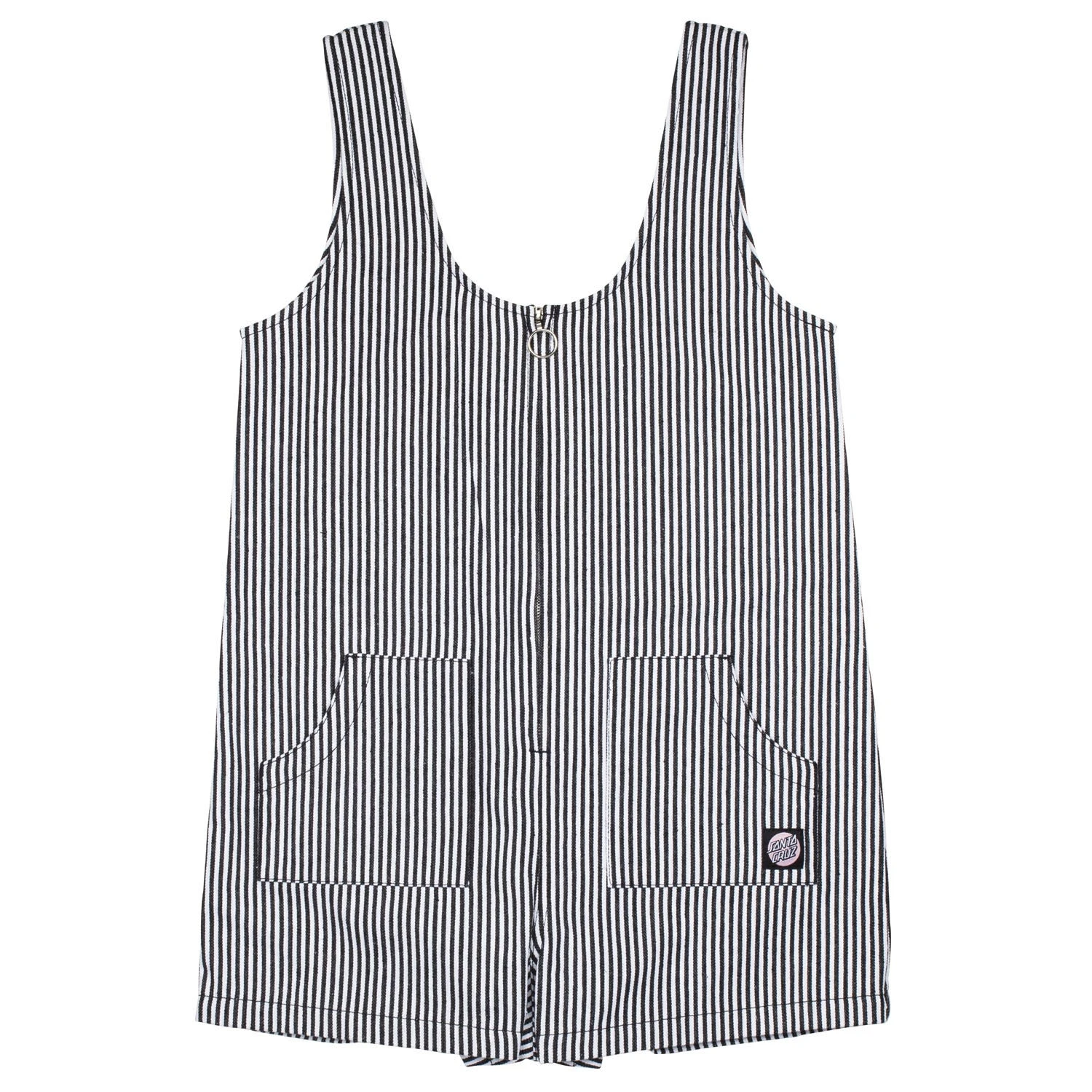 100% cotton, hickory stripe, playsuit with exposed central zipper, front pockets, back pockets and woven label branding.