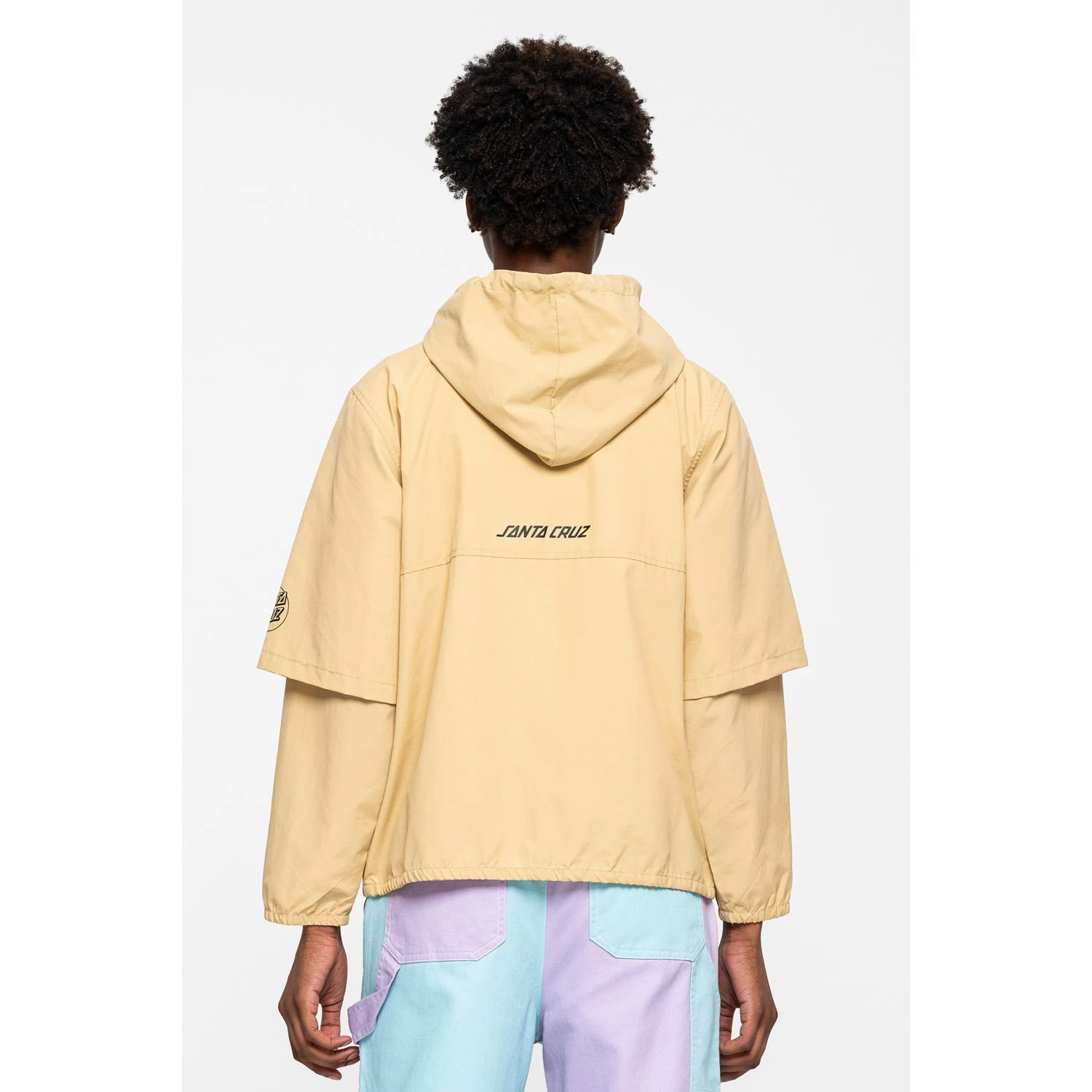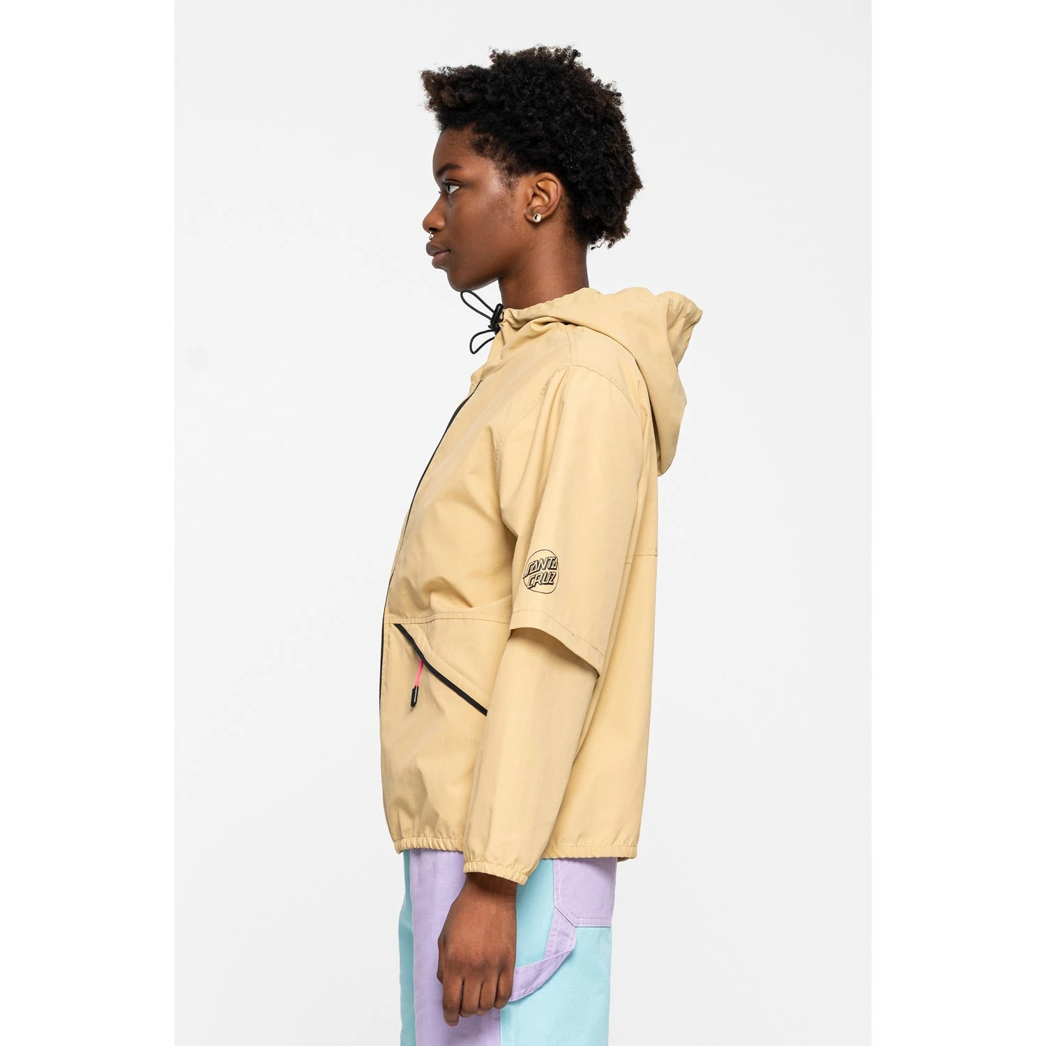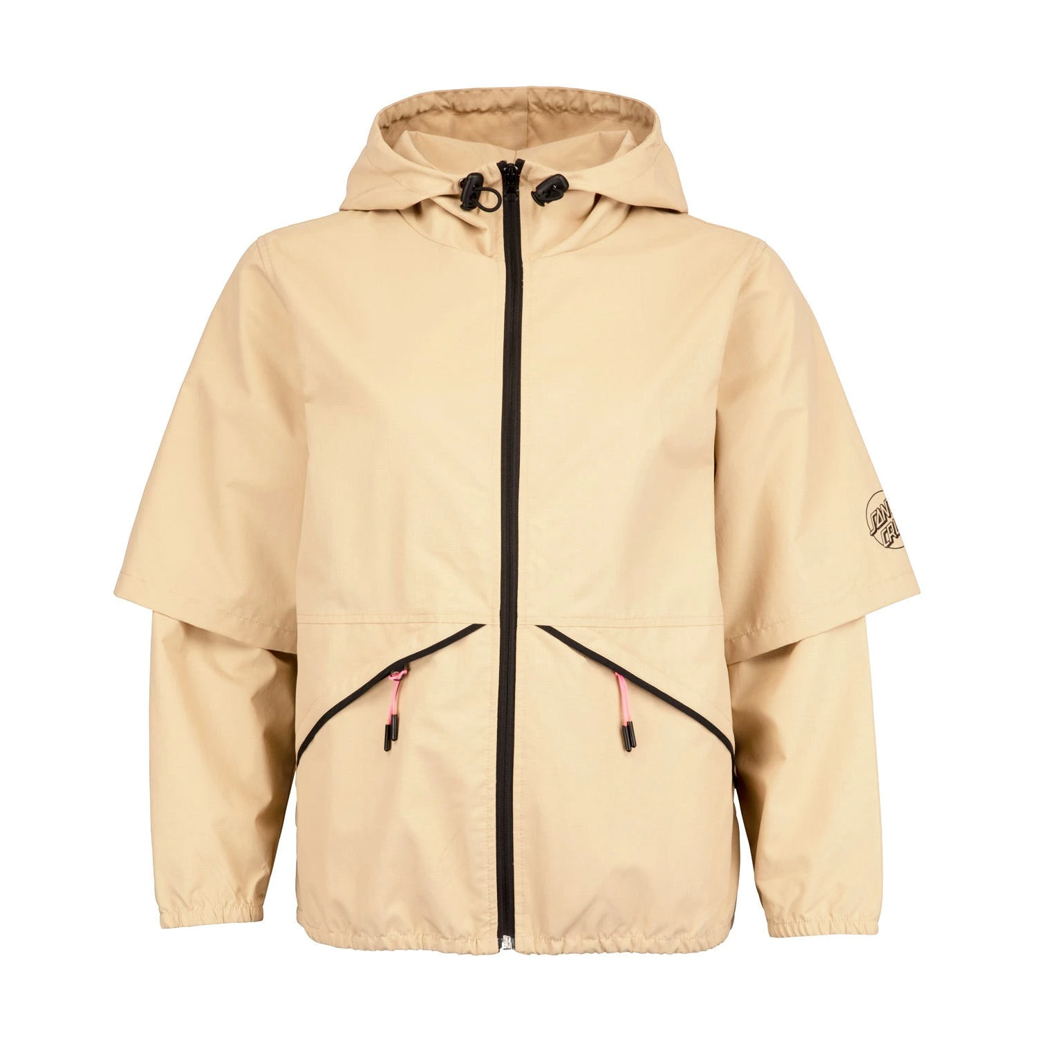 100% nylon, water resistant, regular fit, full zip jacket with panels, zip front pockets, sleeve print and back print