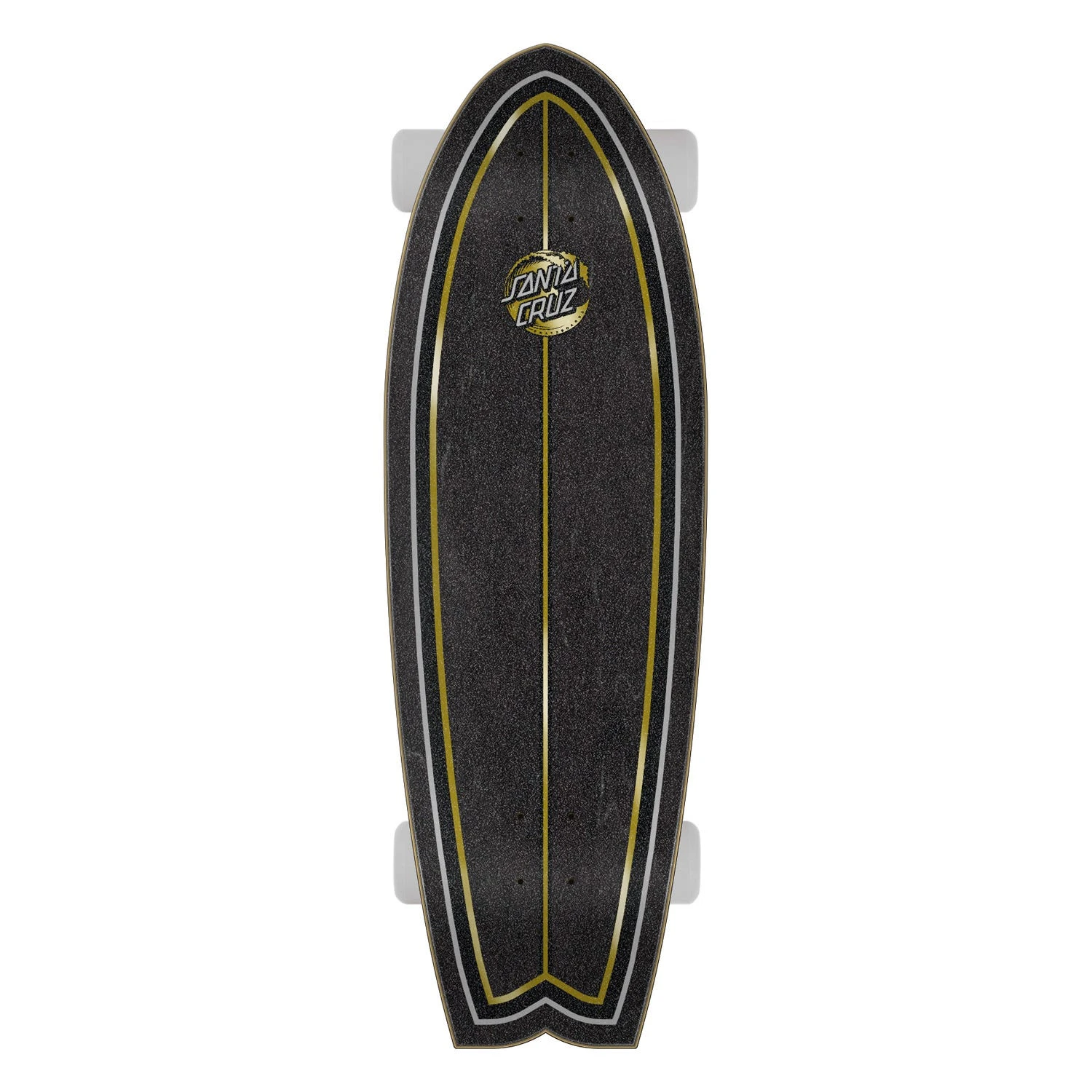 Santa Cruz Skateboards Holo Wave Shark Cruzer featuring prismatic foil graphic on 7-ply surfboard inspired shape with 140mm Bullet trucks, angled risers, Abec 3 bearings and 65mm 78a wheels.