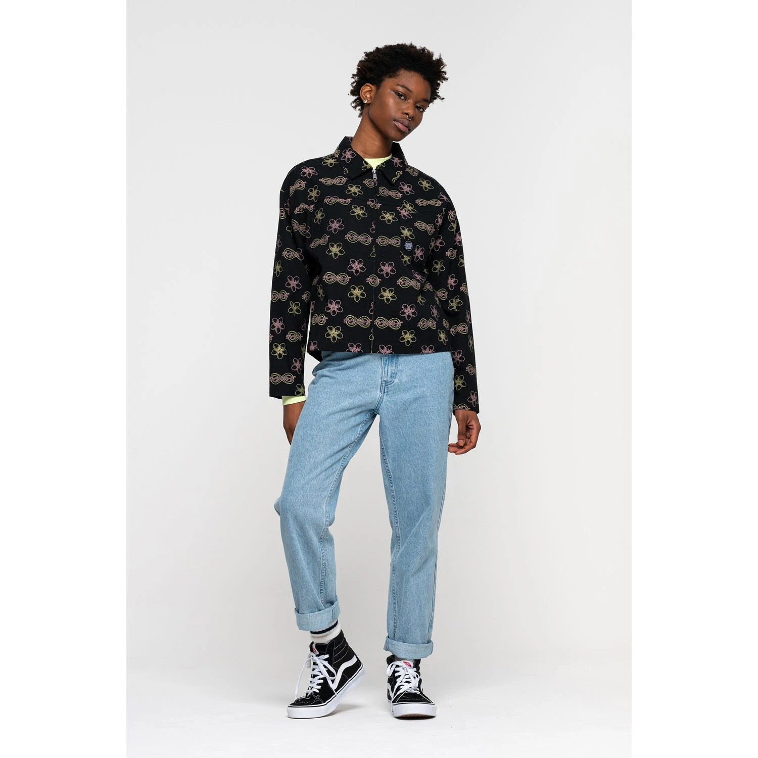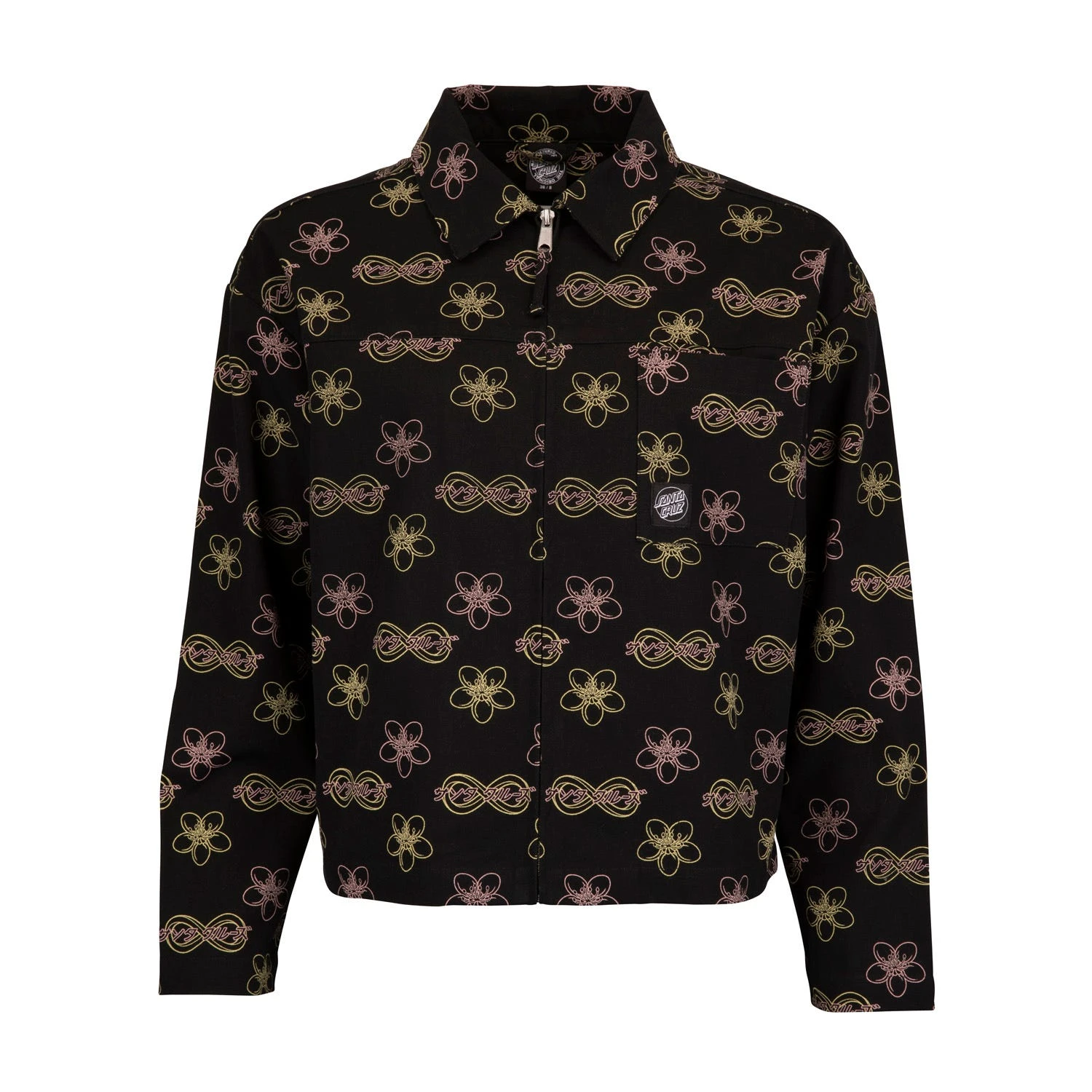 100% cotton canvas, oversized fit, full zip jacket with chest pocket, all over print and woven label branding