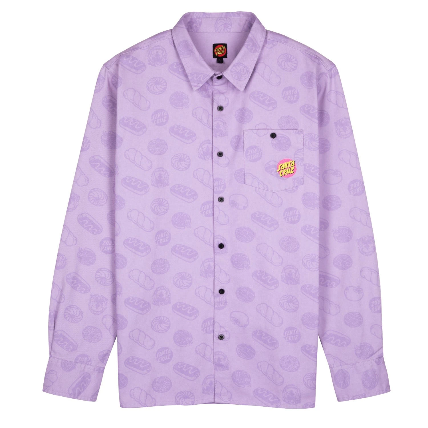 100% cotton twill, long sleeve shirt, button up with left chest pocket, all over print and pocket embroidery