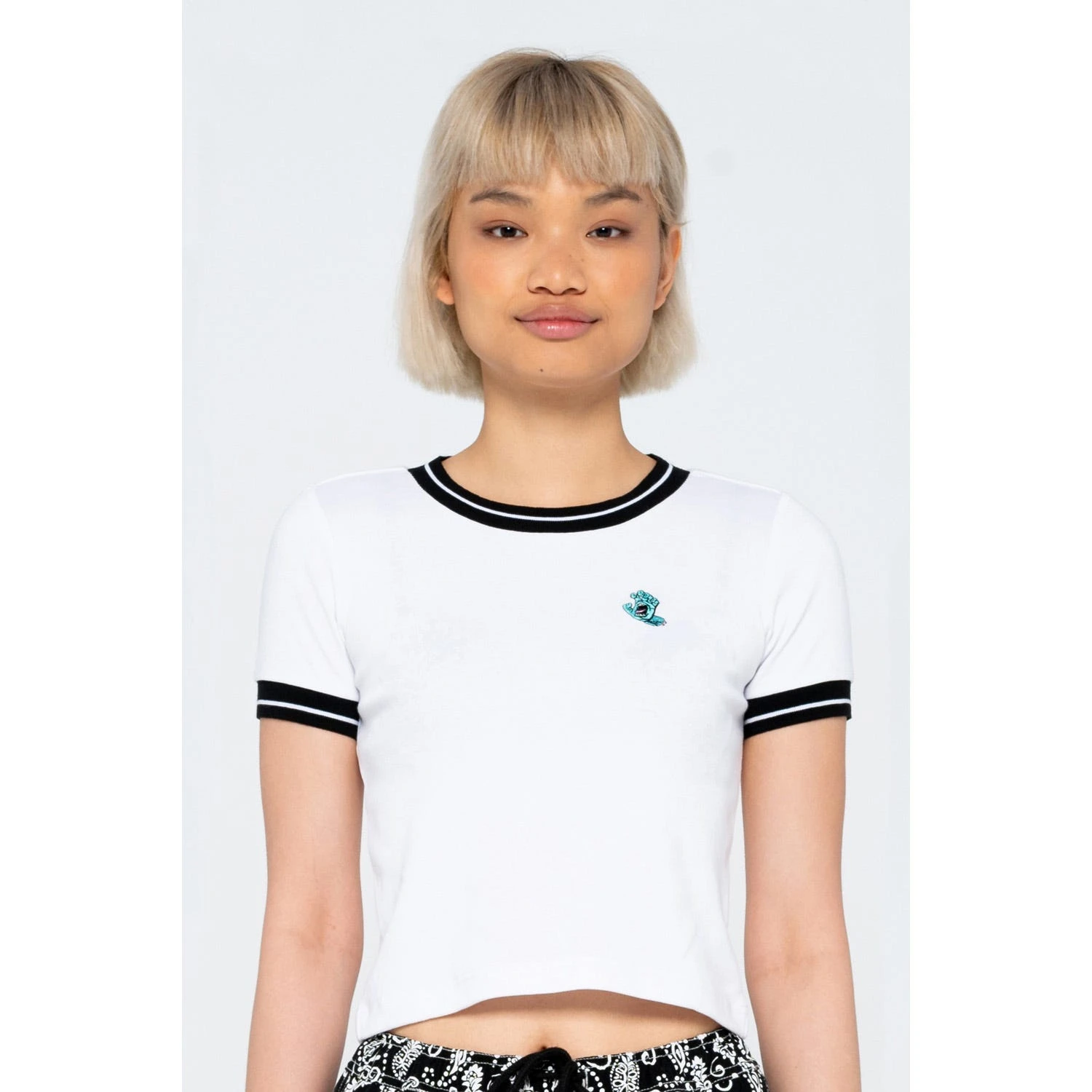 100% cotton, 210gsm rib, cropped, short sleeve ringer t-shirt with left chest embroidery