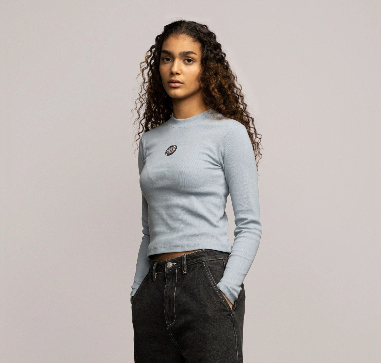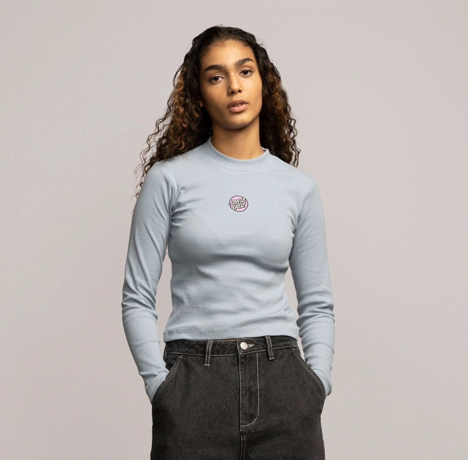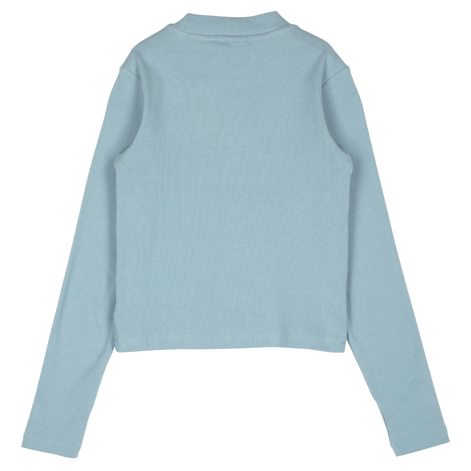 95% cotton, 5% Elastane, 280gsm, 2×1 rib jersey, cropped fit, mock neck long sleeve t-shirt with chest embroidery