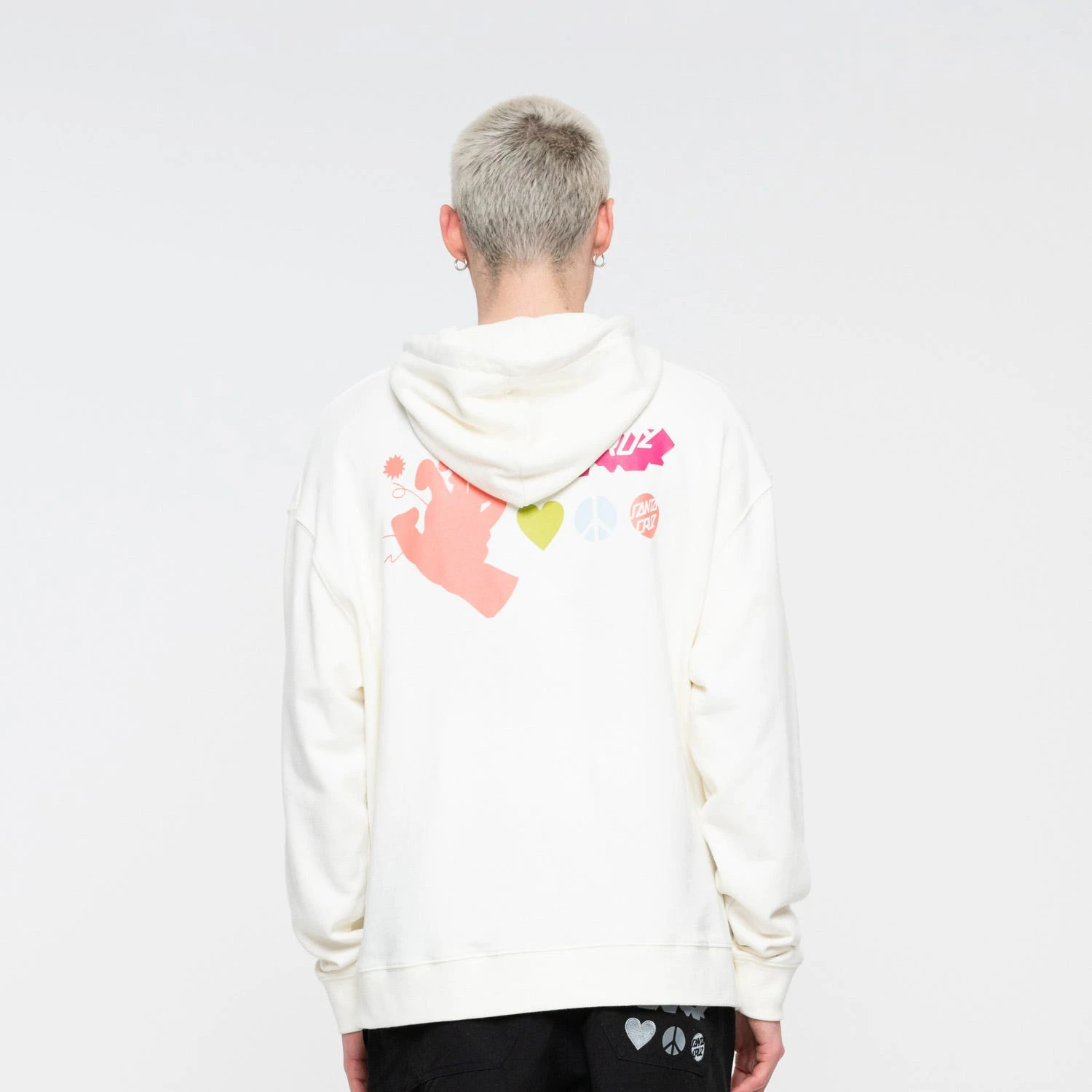 100% organic cotton, 330gsm loopback fleece, boxy fit, hooded sweatshirt with pouch pocket and print at left chest, pouch pocket and back