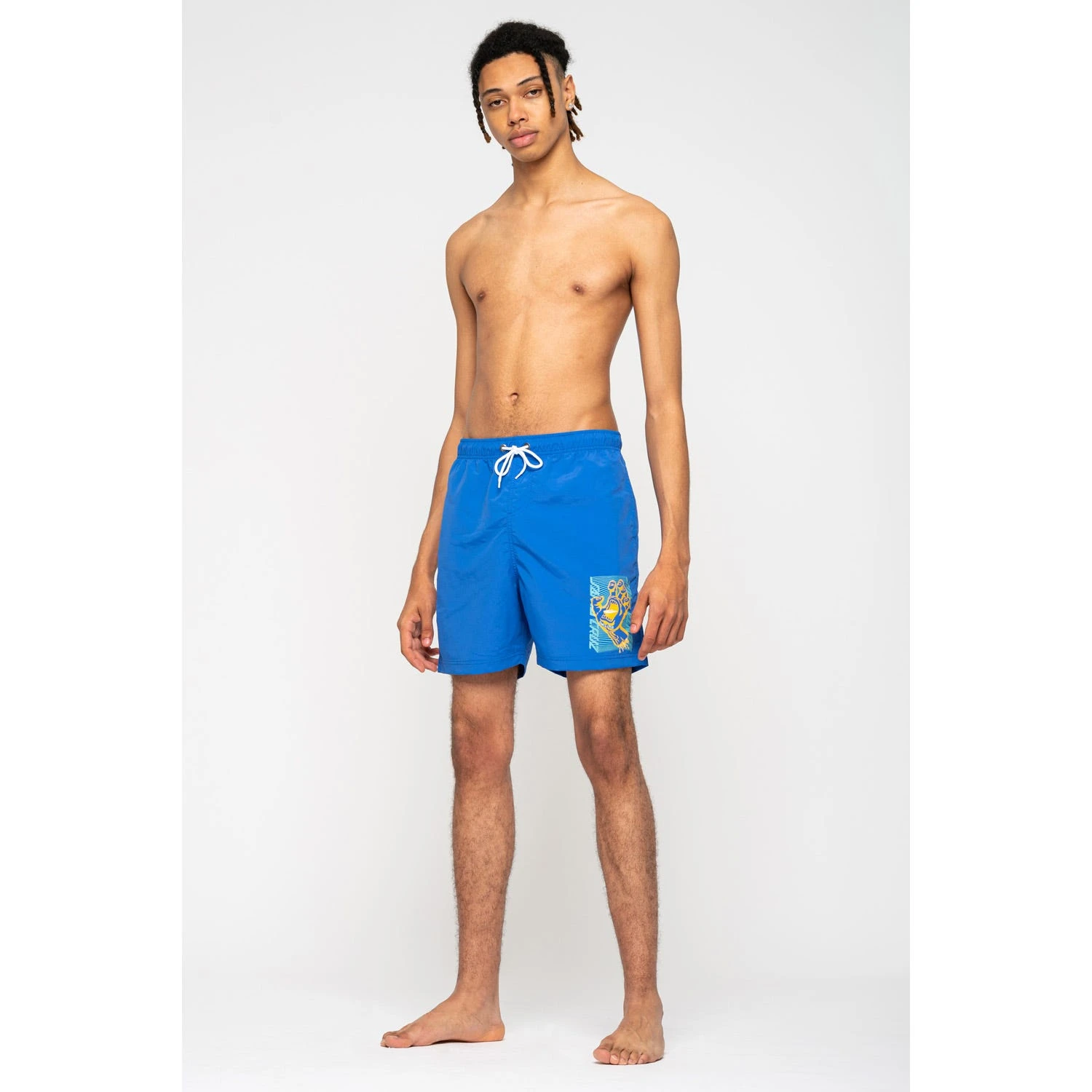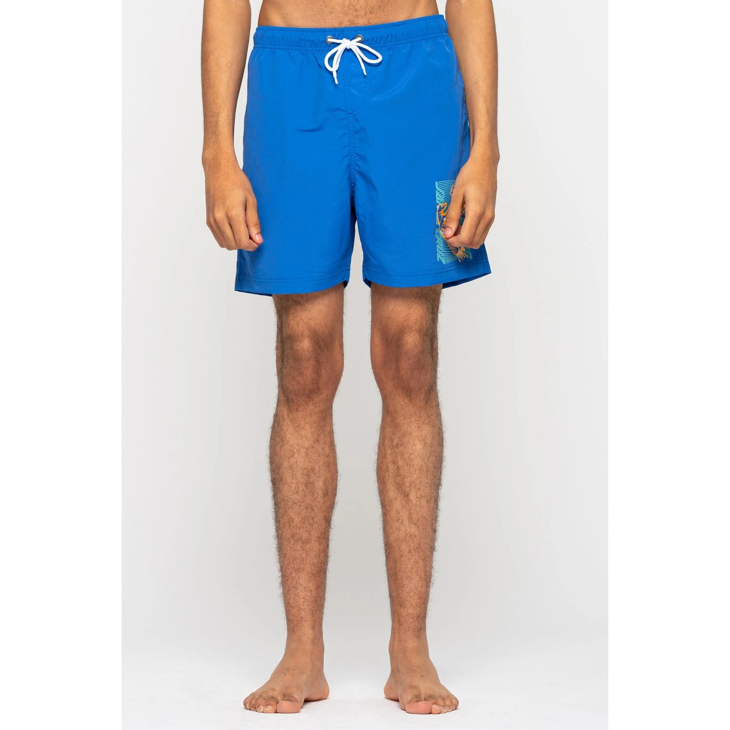 100% nylon, elasticated waist swimshort with 17″ outseam, side pockets and back pocket, all over Aqua React print that’s visible when wet and print at hem.