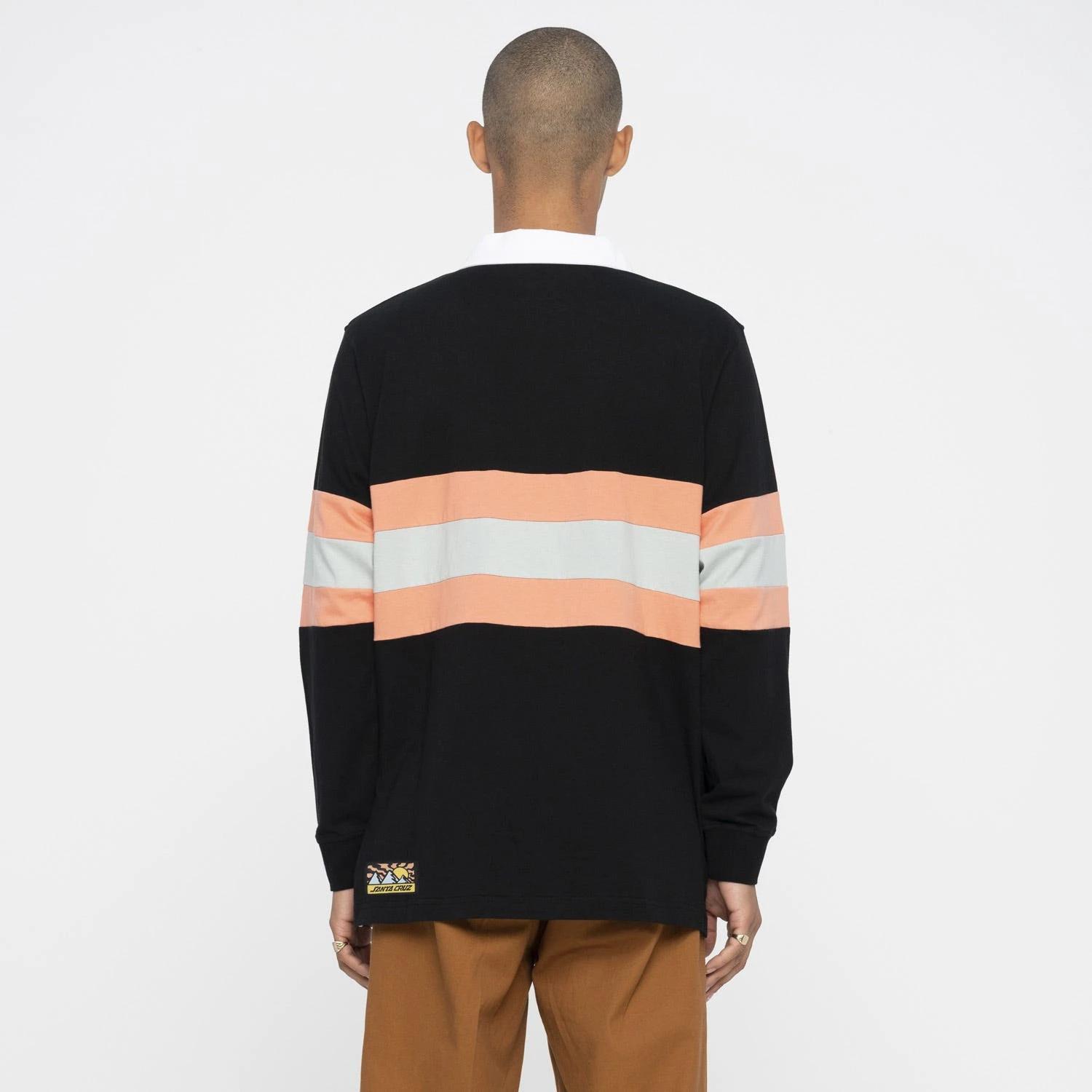 100% cotton, 200gsm jersey, regular fit, long sleeve polo with knitted body and sleeve stripes and front hem woven label