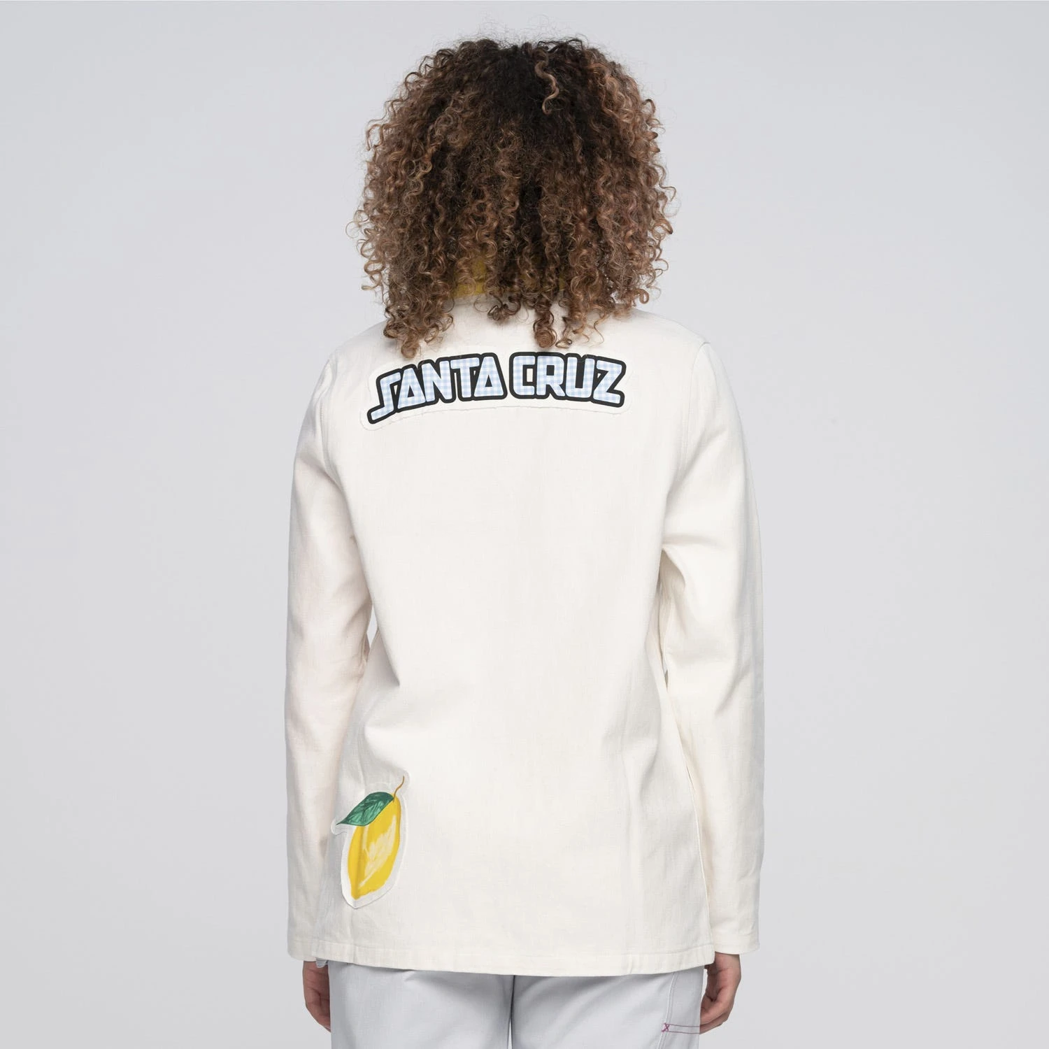 100% cotton denim, regular fit, chore jacket with twin pockets, branded button fastening and printed appliqué patches