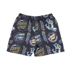 100% polyester, peach micro fibre, elasticated waist swimshort, with mesh pocket bags, all over print and woven label branding